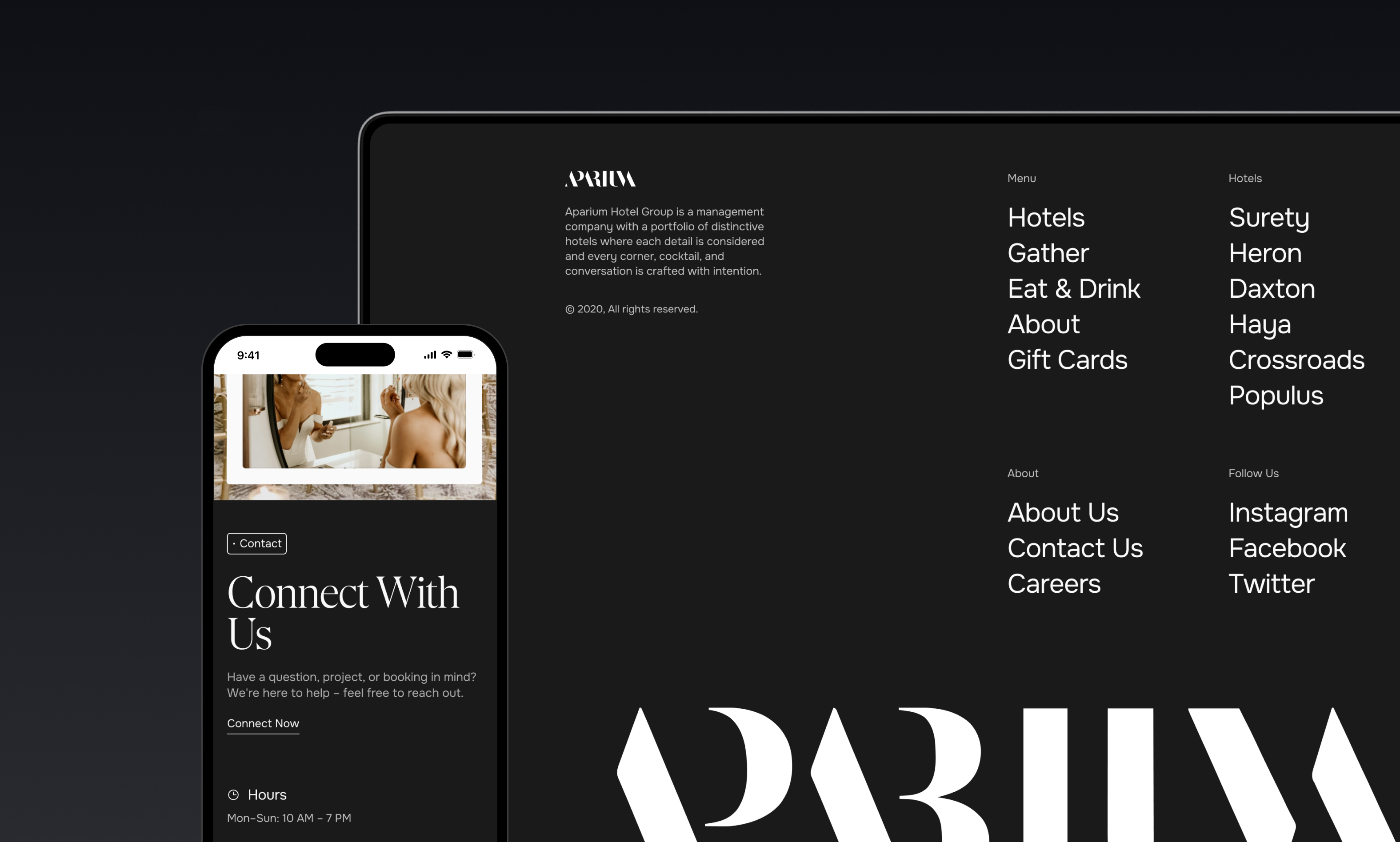 Working with Aparium's brand guidelines for each property, I transformed print and physical environmental design into digital experiences. The trick was to use my previous graphic and visual design knowledge in a combination with my UXR and web development experience.